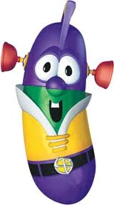 Larry-Boy, the world-famous superhero and an alter-ego of Larry the Cucumber, keeps the town of Bumblyburg safe. This plunger-headed hero fights crime and saves helpless Veggies with assistance from the Larry-Mobile and Alfred, who is played by Archibald Asparagus. Over the years Larry-Boy has undergone slight outfit changes.